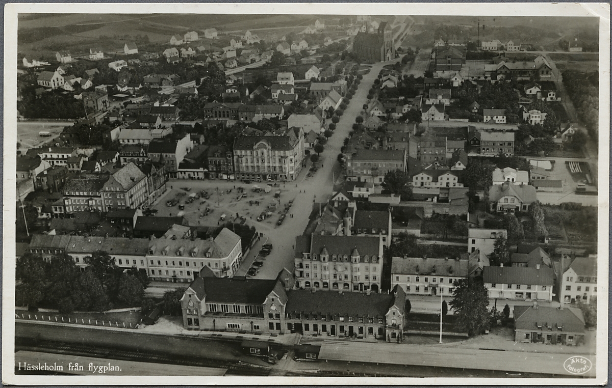 Titel: Flygfoto över Hässleholm med stationen i nederkant.