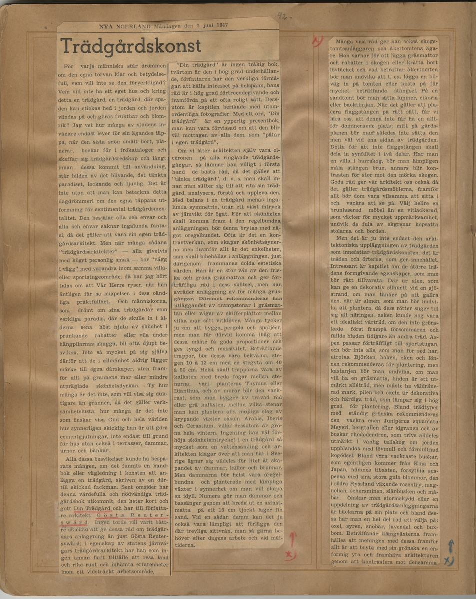 Tidningsklipp ur "Uppsatser om trädgårdar m.m. som på ett eller annat sätt beröra Gösta Reuterswärd. Samlade av Ernst Hj."