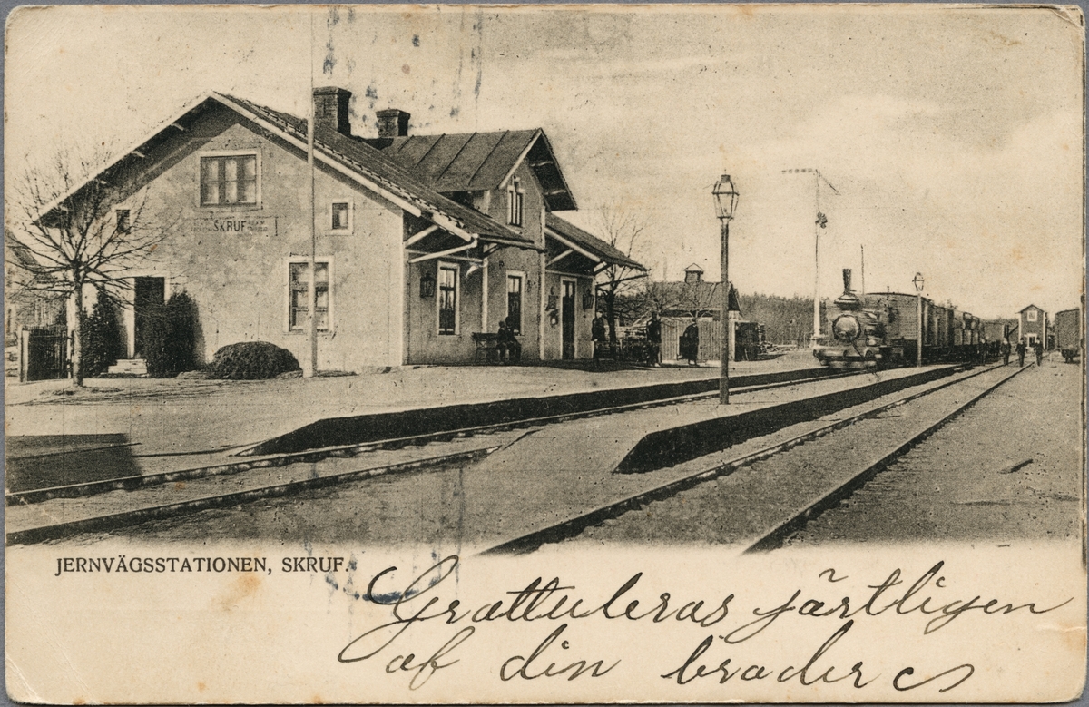 Järnvägsstationen i Skruv. Karlskrona - Växjö Järnväg, CWJ.