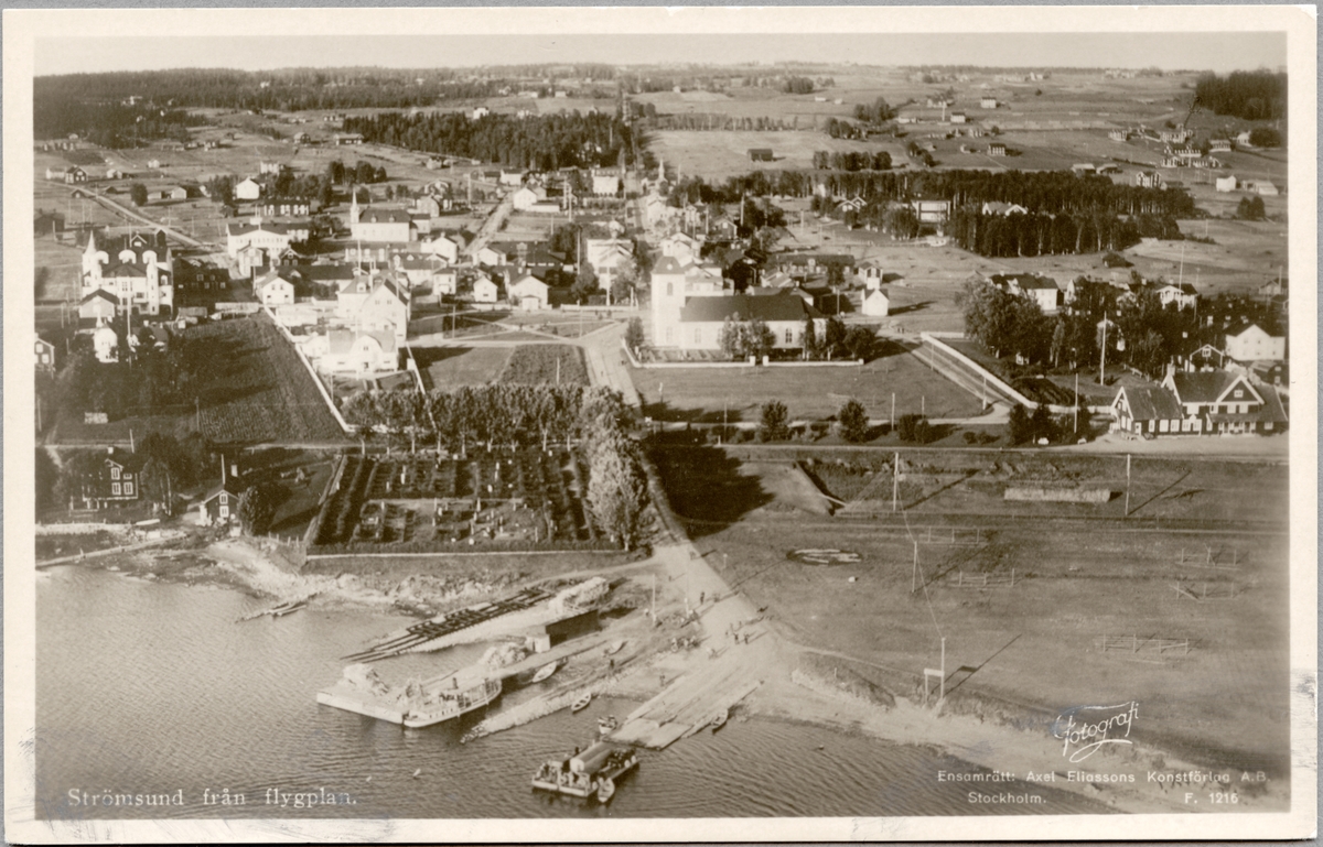 Vy över Strömsunds hamn med samhället i bakgrunden.
