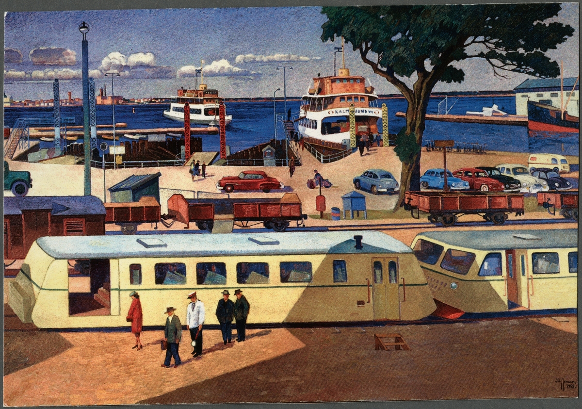 Titel: Kalmarsundsfärjor i Färjestadens hamn. I förgrunden rälsbuss typ Y.