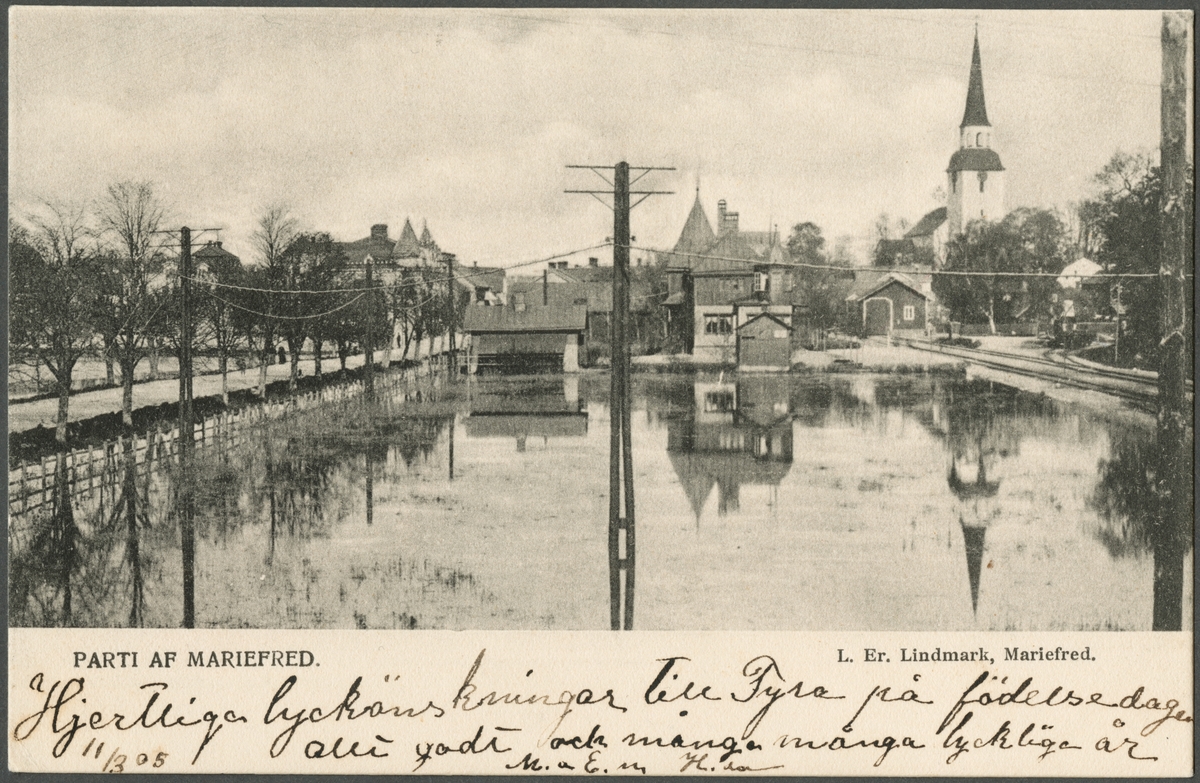 Översvämning i Mariefred, med järnvägsstationen i mitten.