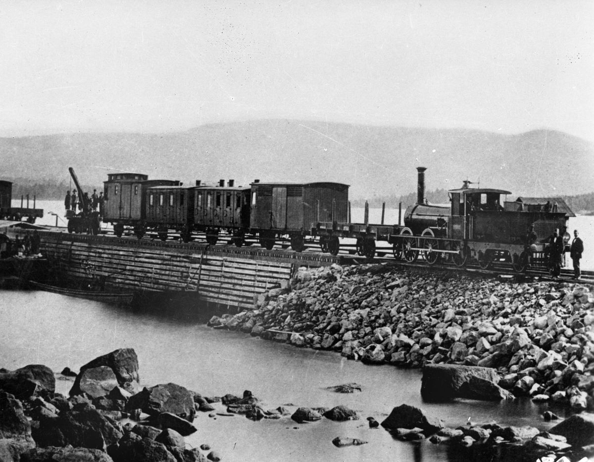Statens Järnvägar, SJ F 68 "Finnveden" med persontåg på kajen vid sjön Bergviken.