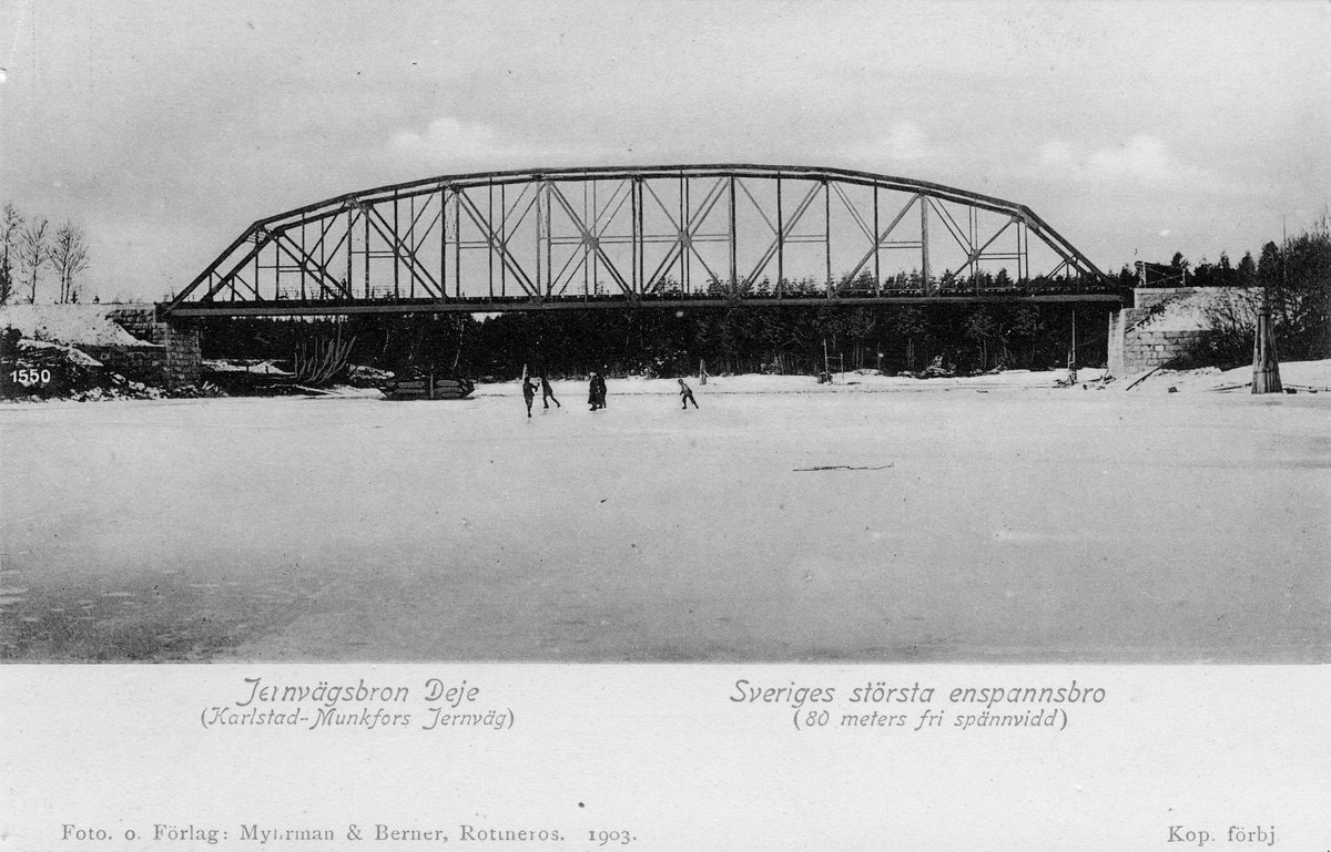 Titel: Järnvägsbro över Klaraälven i Deje. Skridskoåkning under bron.