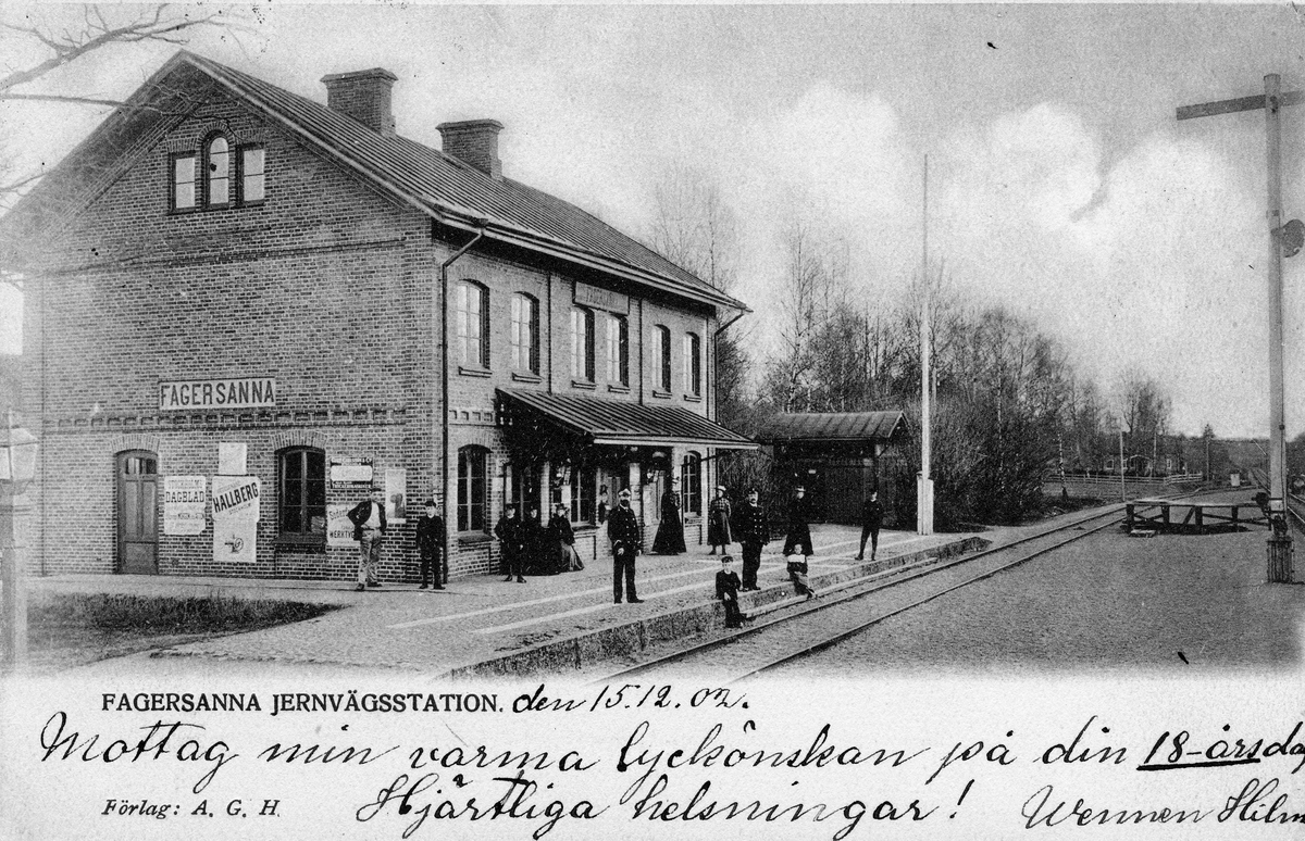 Titel: Järnvägsstation i Fagersanna. Trafikplatsen anlagd 1870. Vid järnvägsspåret mellan Skövde och Karlsborg