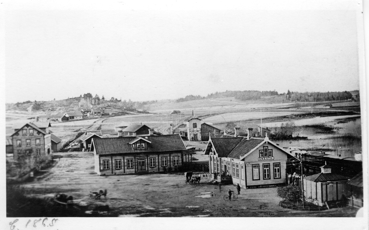 Järnvägsstationen i Gnesta, med diverse olika byggnader på området.
