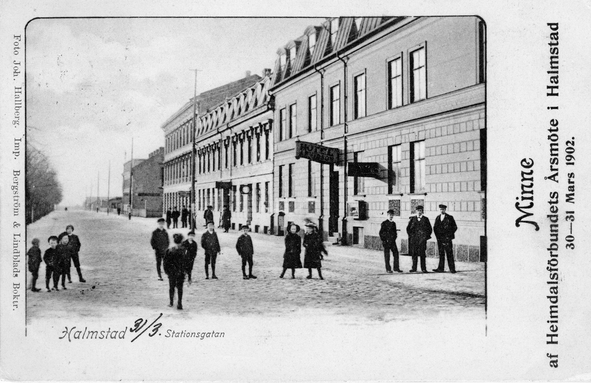 Några människor, vuxna och barn på Stationsgatan i Halmstad. Text på vykort: "Minne af Heimdalsförbundets Årsmöte i Halmstad 30-31 Mars 1902."