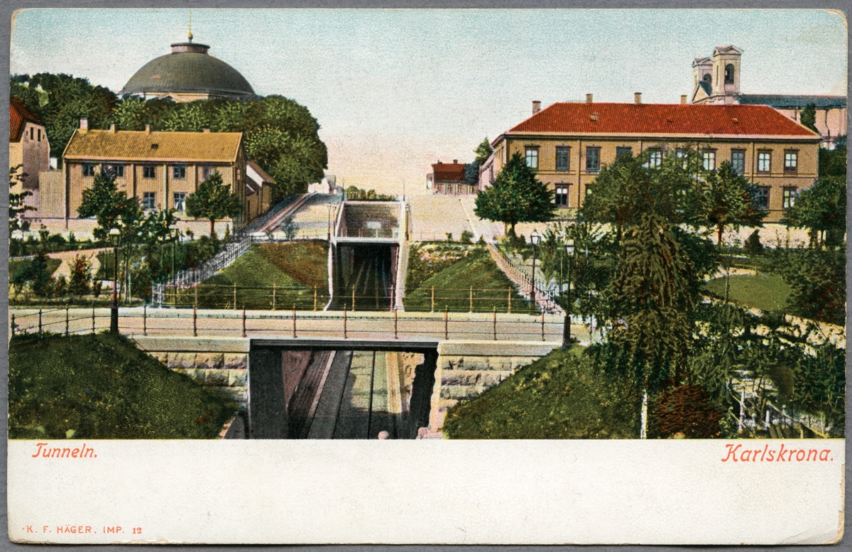 Järnvägstunneln i Karlskrona, kolorerat vykort.