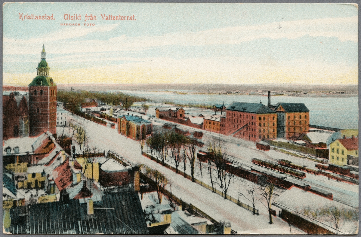 Titel: Vy över Kristianstad med järnväg och Hammarsjön i bild.
