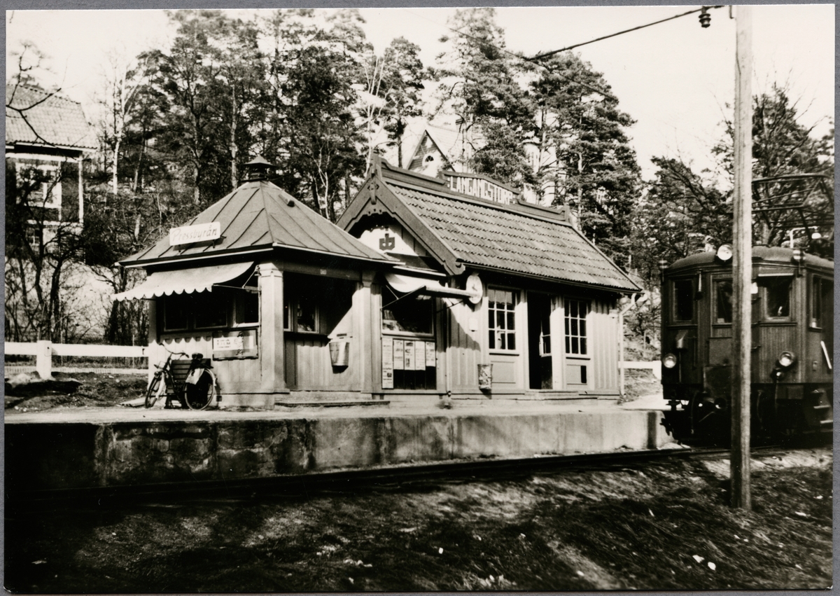 Stockholm - Roslagen Järnväg, SRJ elmotorvagn 17 vid Långängstorp hållplats.
