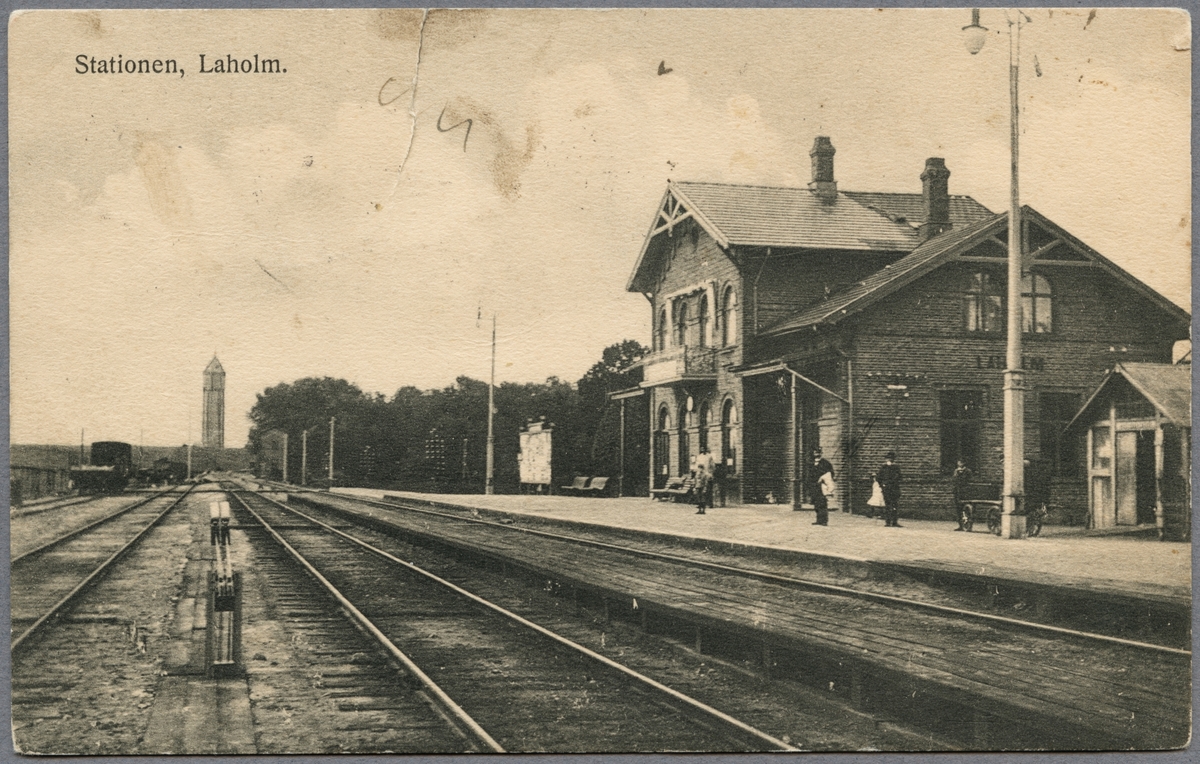 Järnvägsstationen i Laholm med vattentornet i bakgrunden.