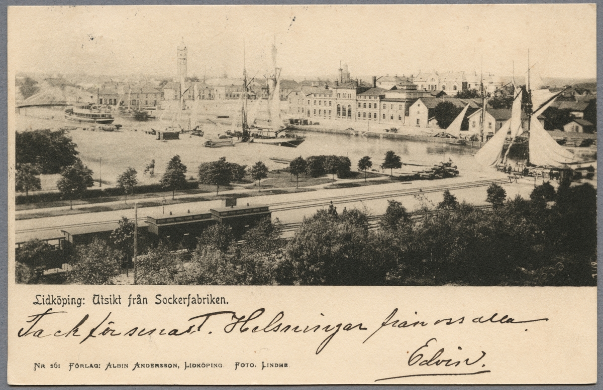 Utsikt från Sockerfabriken i Lidköping, med Hamnen och Vattentornet.
