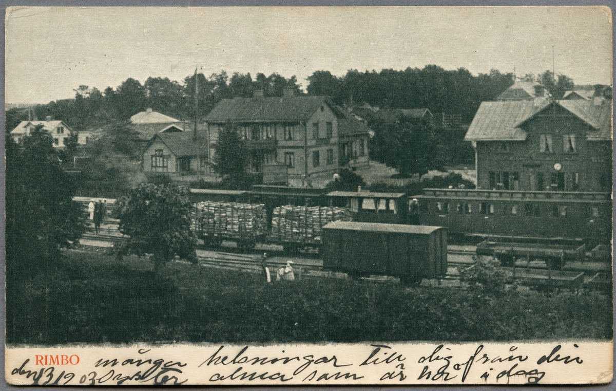 Titel: Rimbo med järnvägsstationen till höger i bild.