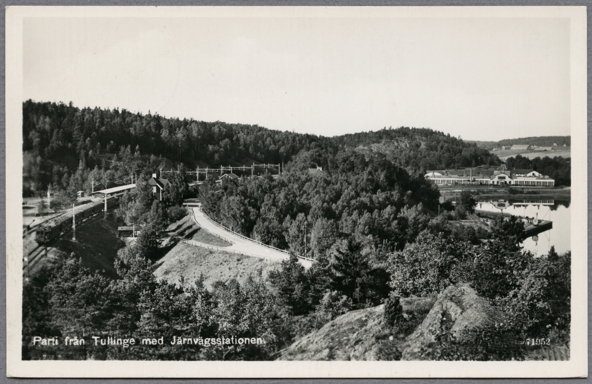 Titel: Tullinge järnvägsstation. Den sydligaste delen av Tullingesjön kan ses i den högra delen av fotografiet.