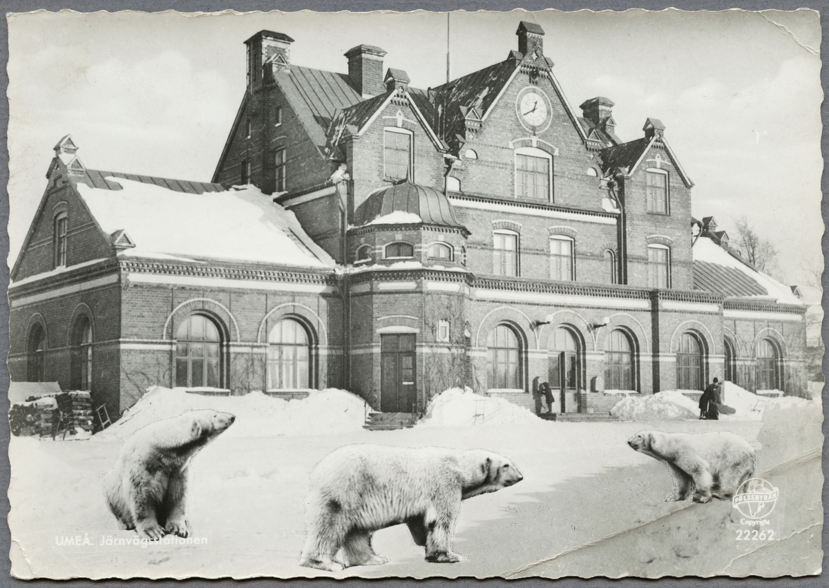 Titel: Isbjörnar (montage) på gatan framför järnvägsstationen i Umeå.