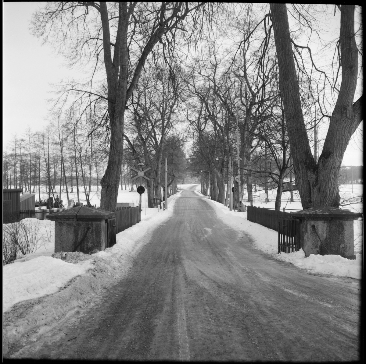 I allén mitt i bild ses en järnvägsövergång med bommar och signal som användes av Museijärnväg Östra Södermanlands Järnväg, ÖSlJ. Bilden är tagen strax utanför lokstallet i Mariefred.