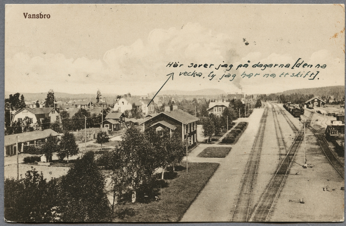 Titel: Stationsmiljö i Vansbro med vagnar och stad i bild.