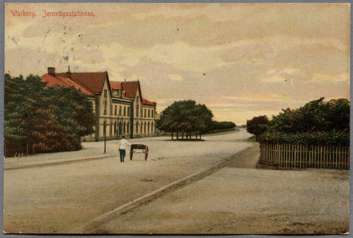 Titel: Gatuvy i Varberg med stationshus i bakgrunden runt sekelskiftet.