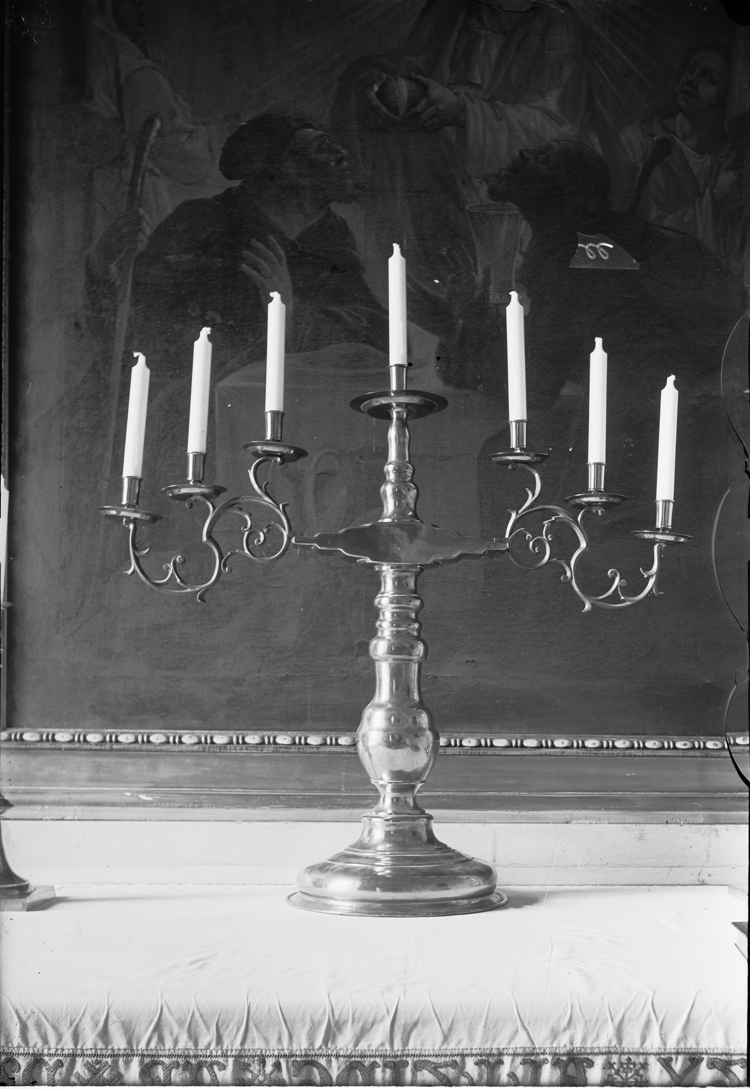 Kandelaber, malm, sjuarmad. Gåva 1754.