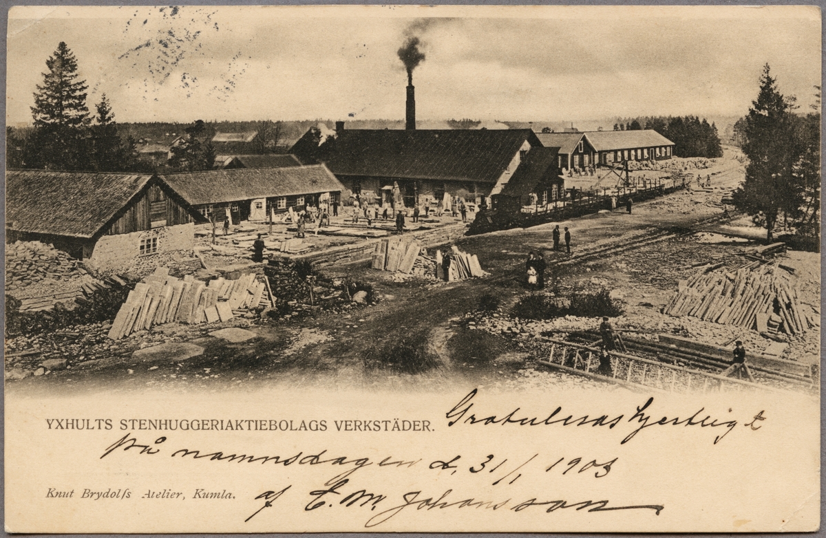 Titel: Verkstäder vid Yxhult stenhuggeri.