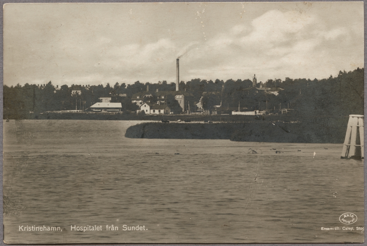 Titel: Kristinehamns sjukhus sedd från vattnet.