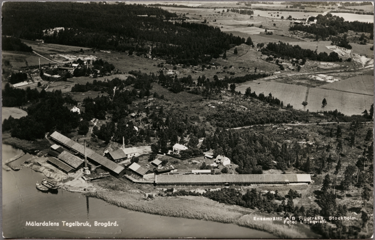 Flygfoto över Mälardalens Tegelbruk vid Kvistabergs strand i Mälaren.