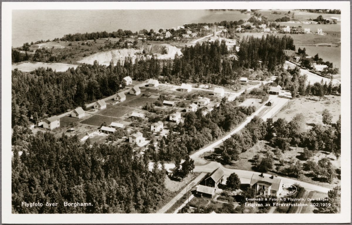 Titel: Flygfoto över Borghamn med Vättern i bakgrunden.