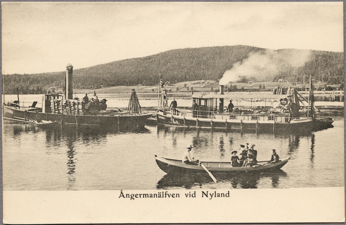 Titel: Ångermanälven vid Nyland. I bakgrunden ångbåtarna Gesund och Kaparen.