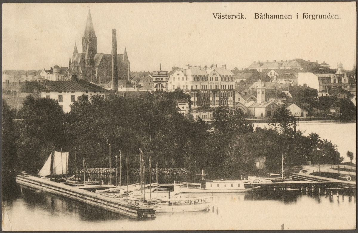 Titel: Vy över Västervik med Sankt Petri kyrka i fonden.
