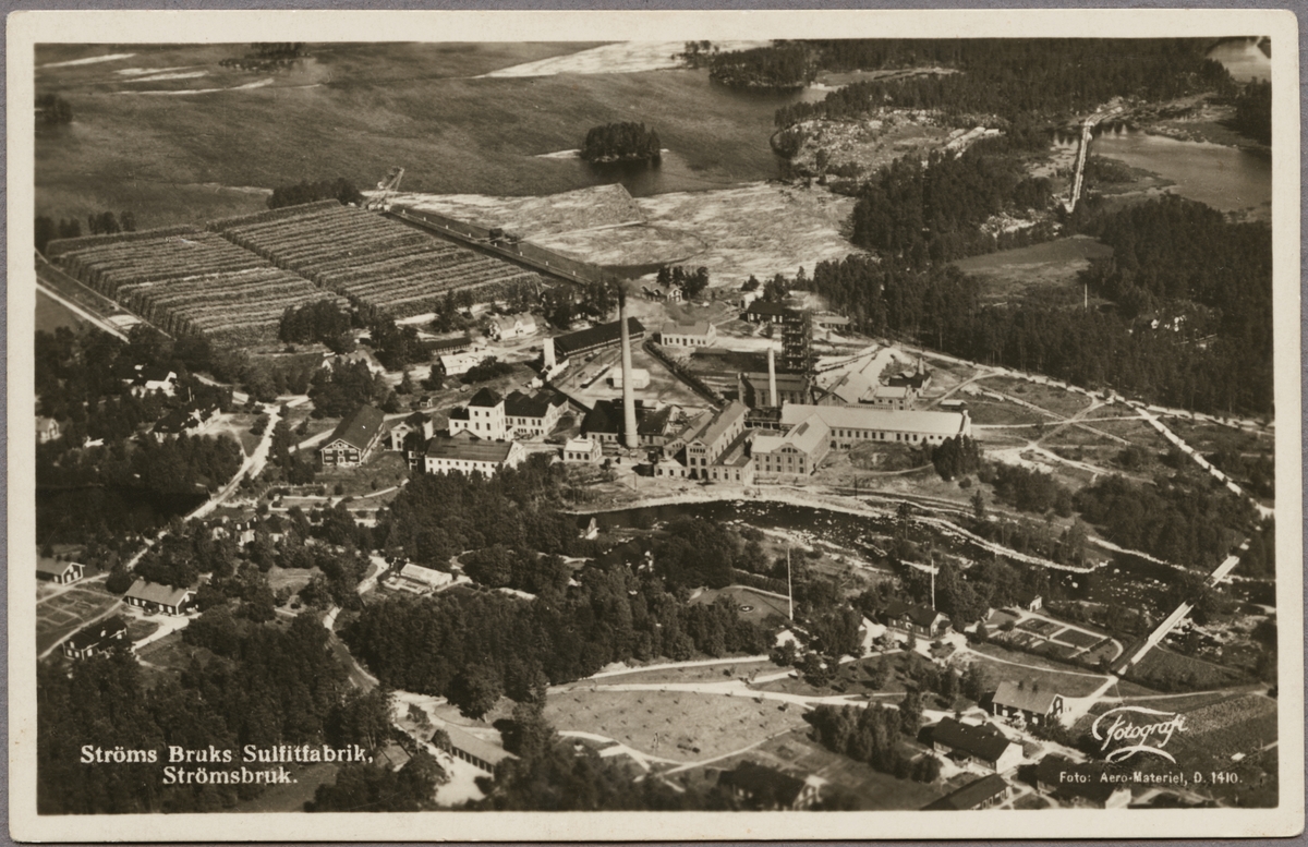 Flygfoto över pappersmasseindustri i Strömsbruk.