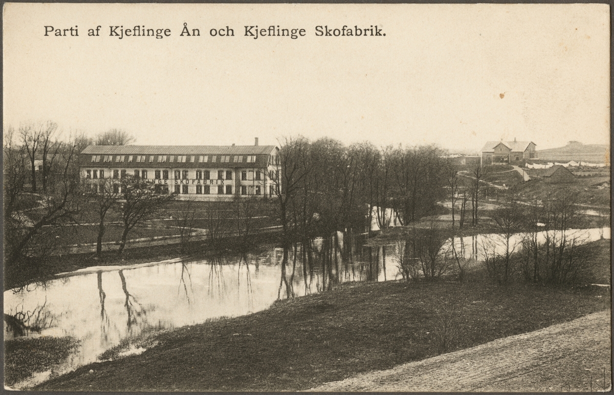 Titel: Vy över Kävlingeån med skofabrik i bakgrunden.