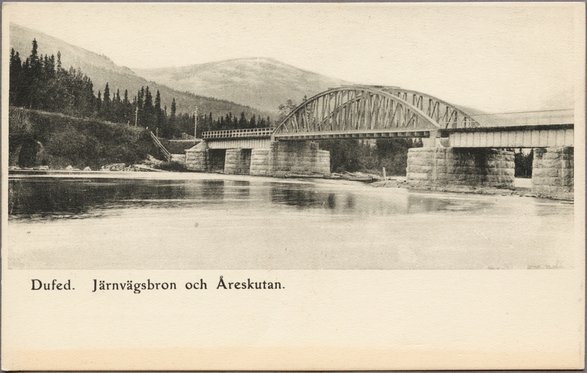 Titel: Järnvägsbro över Forsaforsen på linjen mellan Duved och Storlien med Åreskutan i bakgrunden.