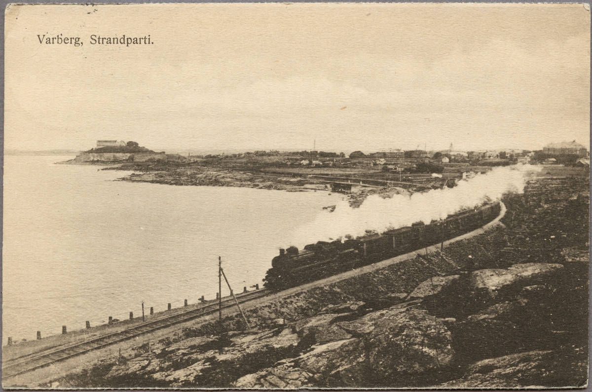 Vy över järnvägslinjen vid Varberg, Varberg fästning i bakgrunden.