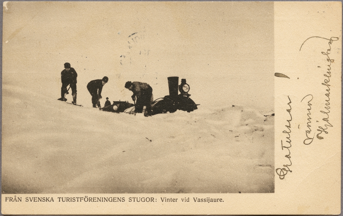 Titel: Personal skottar snö vid ånglok i Vassijaure.