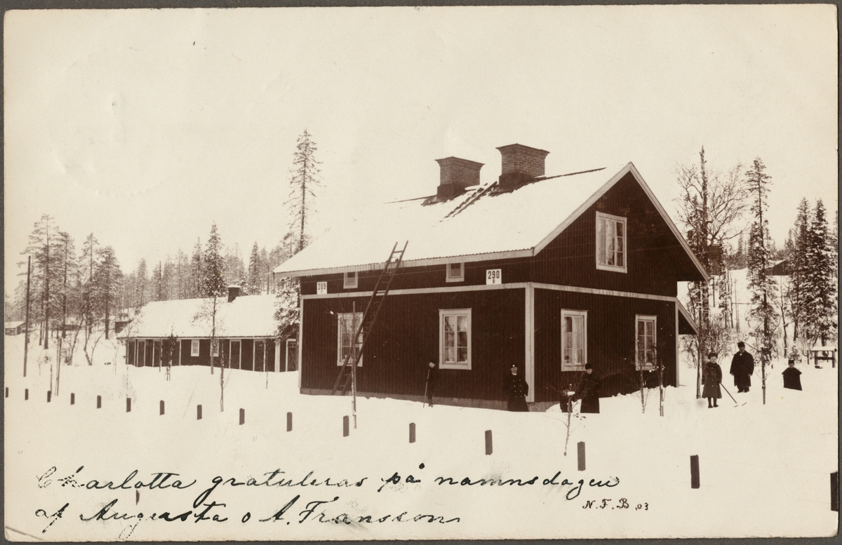 Titel: Vintervy på banvaktstuga med personal och barn.