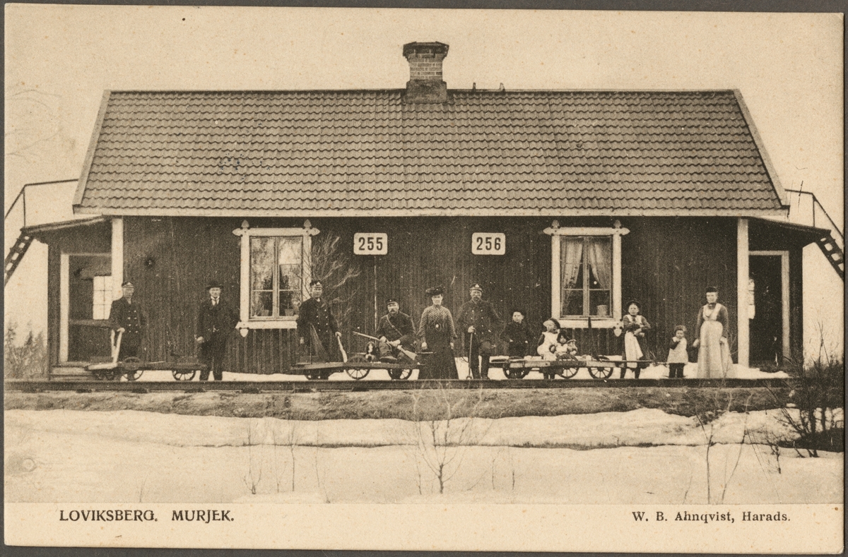 Banvaktstugor 255 & 256 vid Loviksberg, Murjek, efter linjen Boden - Gällivare. Banvakter med familjer uppställda för fotografering.