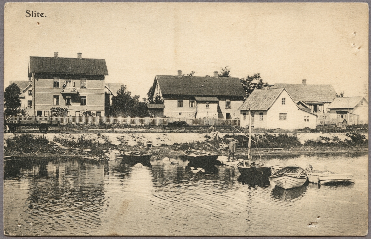 Titel: Småbåtshamn vid järnväg och samhälle.