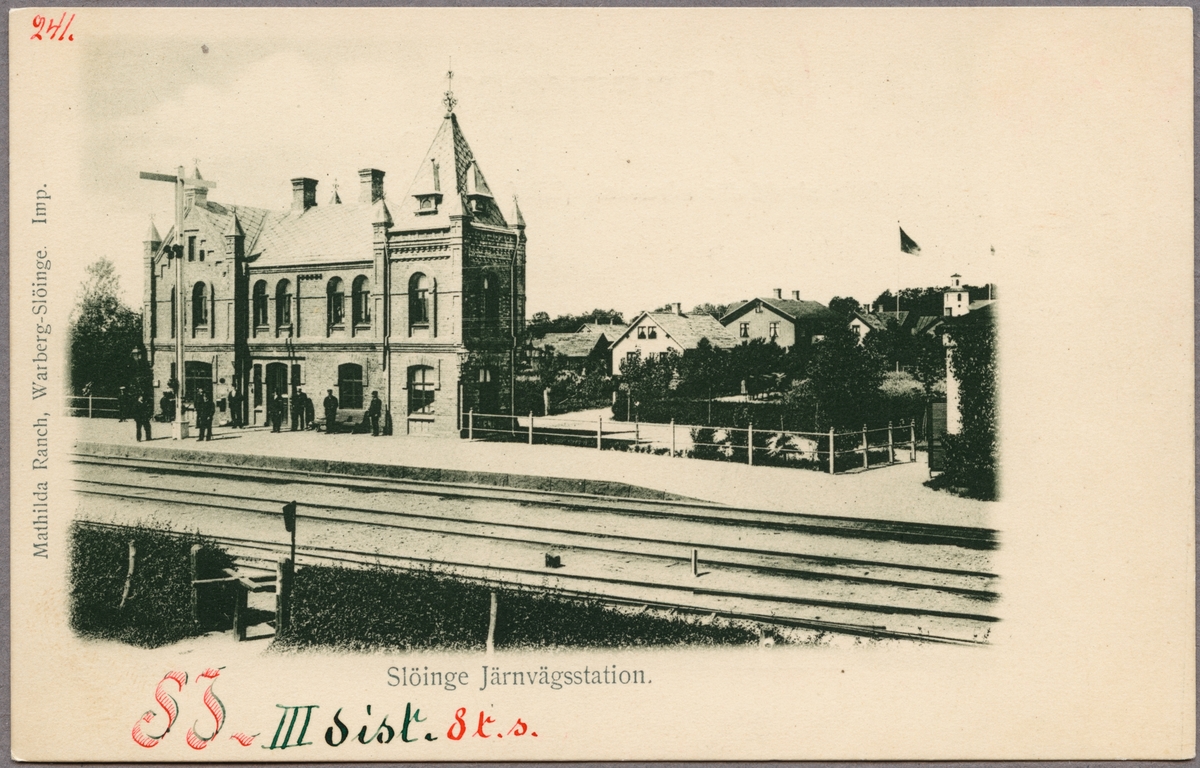 Titel: Vy på stationsområde med bebyggelse i bakgrunden.
