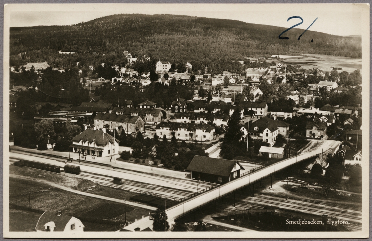 Titel: Flygfoto över stad med stationsområde och bostäder i bild.