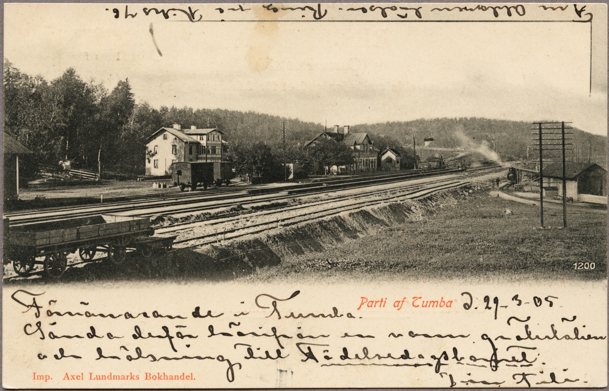 Titel: Stationsområde och bangård med godsvagnar och del av samhälle i bild.