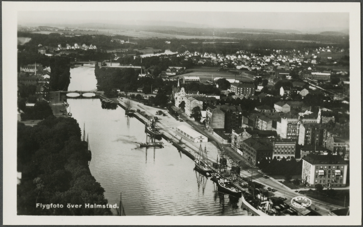 Titel: Flygfoto över Hamnen och Nissan i Halmstad.