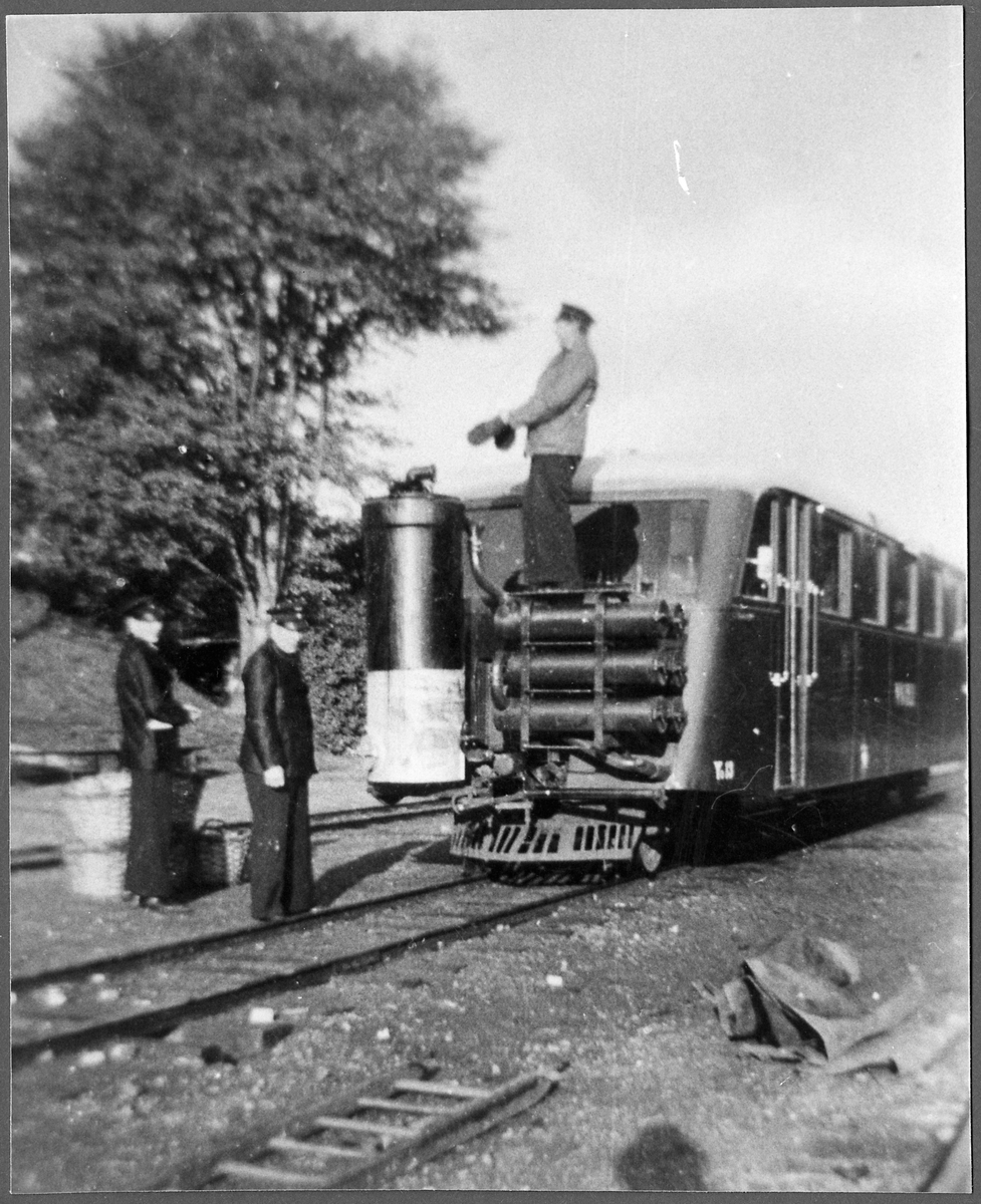 Påfyllning av ved i Falerum för gengasdrivning av Norsholm - Västervik - Hultsfreds Järnvägar, NVHJ Yo 13.