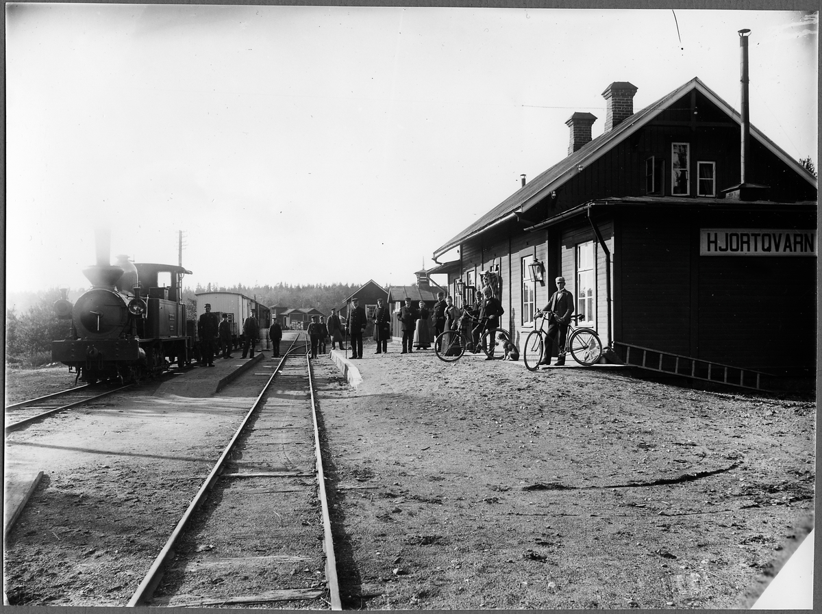 Titel: Hjortkvarn station med Norra Östergötlands Järnvägar, NÖJ lok 4 "Haddebo" och tågsätt.