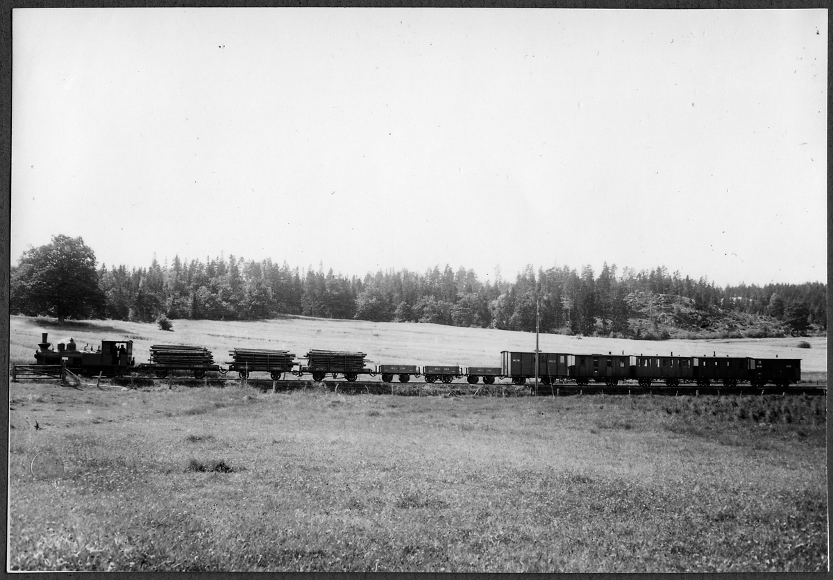 Norra Östergötlands Järnvägar, NÖJ lok 1 "Finspong". Godsvagnar, NÖJ 77, 1134, 1105, 1141.