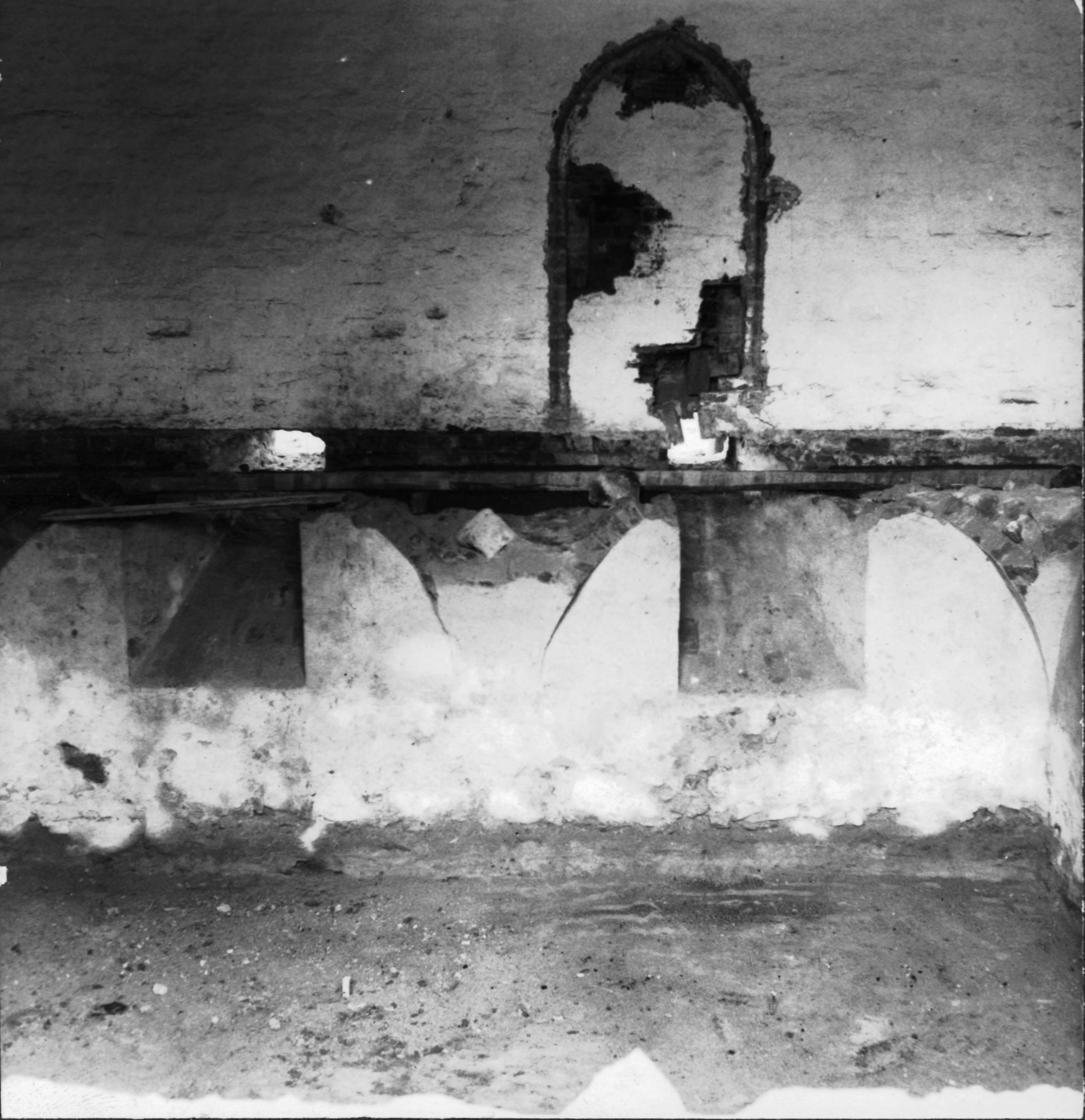 Korets nordvägg med en delvis frilagd senmedeltida portal.