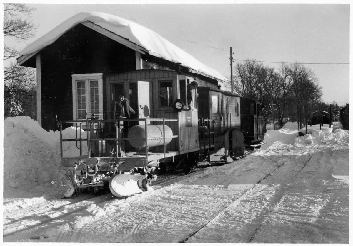 Vinterbild från Ankarsrums bangårdsområde. Snöröjningståg med lokomotor, snöskrapa samt vingplog.