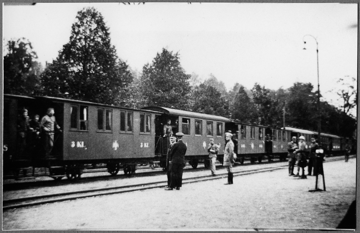 Titel: Persontåg med militärer vid en övning väntar vid Verkebäck station.