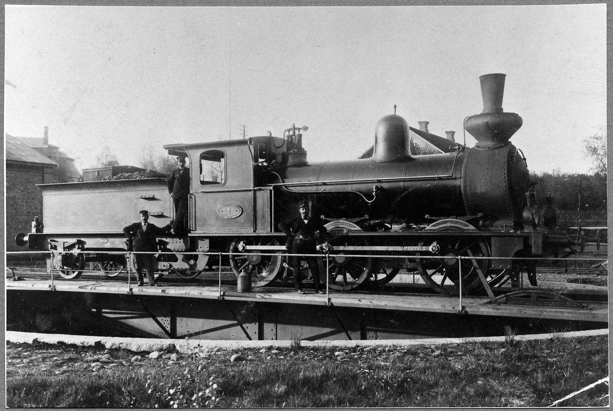 Mora Vänerns Järnväg, MVJ lok 1 och personal på vändskiva.