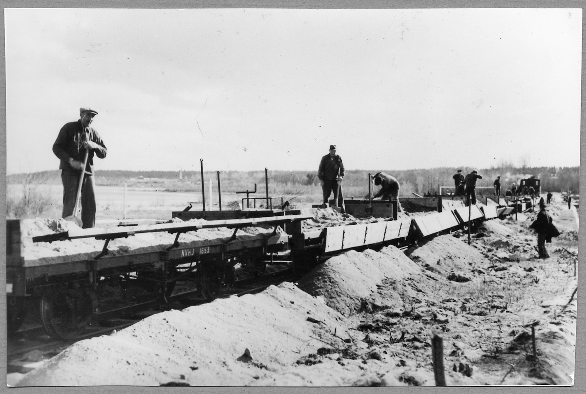 Linjeomläggning vid Hultsfred. Norsholm - Västervik - Hultsfreds Järnvägar, NVHJ lok 11, NVHJ grusvagn 1653.