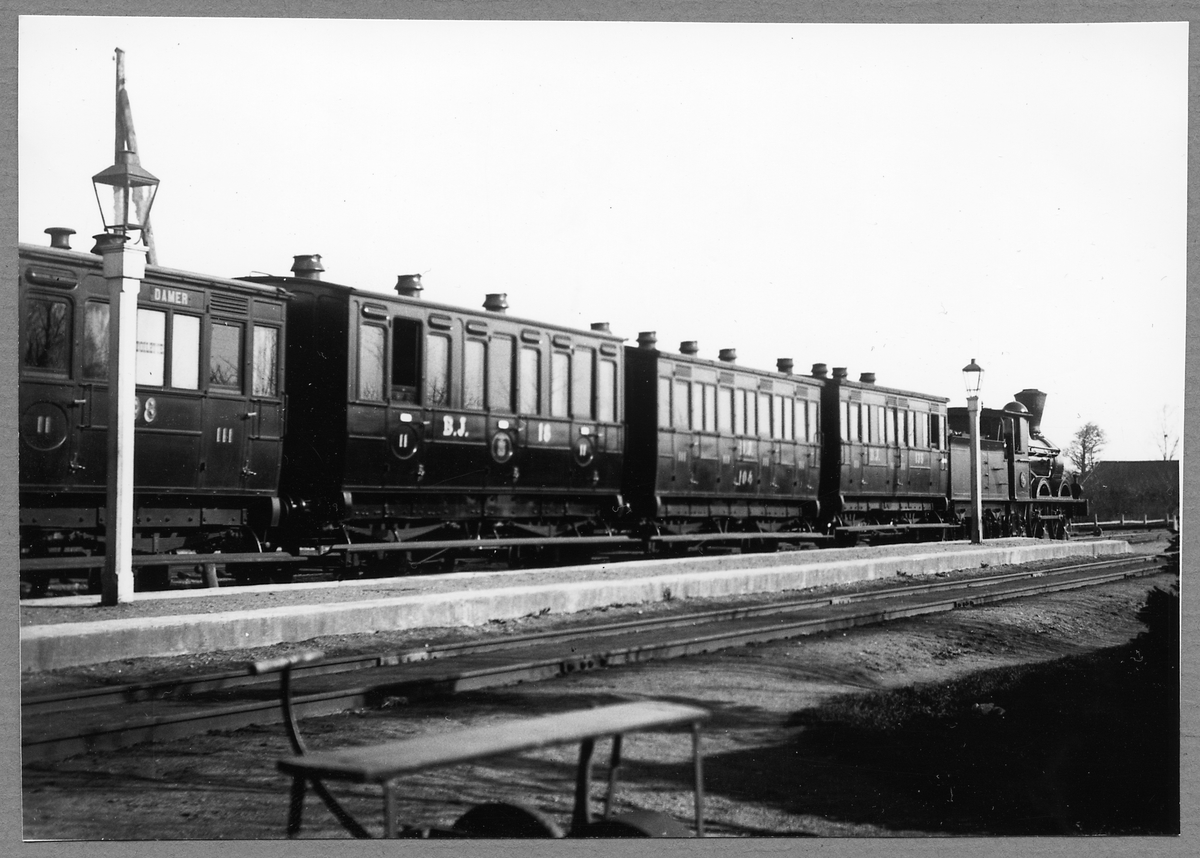 Persontåg draget av Bergslagernas Järnvägar, BJ lok 21 vid Öxnered station.